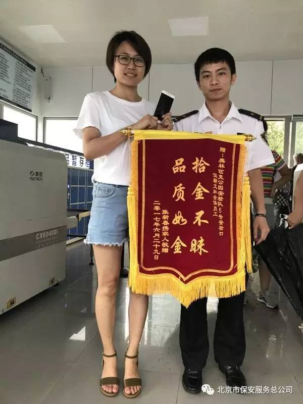 7月6日中午,家住河南的張新春專程乘火車來到北京奧林匹克公園5號安檢口,向全體安檢員隊員贈送一面“拾金不昧 品質(zhì)如金”的錦旗,稱贊“你們是北京安檢員的榜樣”。