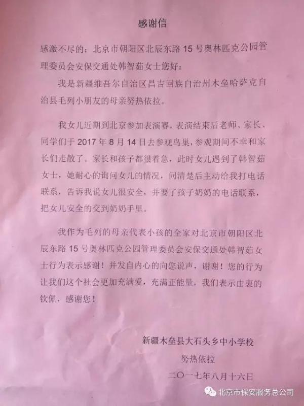 原來,努熱依拉女士的女兒毛列8月14日在鳥巢游玩期間與家長(zhǎng)走散,找不到親人的小女孩遇到了正在執(zhí)勤的韓智茹,她積極幫助孩子聯(lián)系到家人,并一直將孩子送到一公里外的科技館,交給孩子的奶奶。