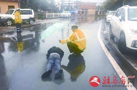 馬路上車(chē)來(lái)車(chē)往,躺在路上太危險(xiǎn)了。于是,李浩罡、曾華崗試圖叫醒醉酒男子,但該男子毫無(wú)反應(yīng)。出于安全考慮,其中一人蹲下給躺在地上的醉酒男子撐起雨傘(如圖),另一人向公安派出所匯報(bào)。李浩罡和曾華崗直到民警趕到,把醉酒男子抬上警車(chē),才回到崗位上繼續(xù)執(zhí)勤。