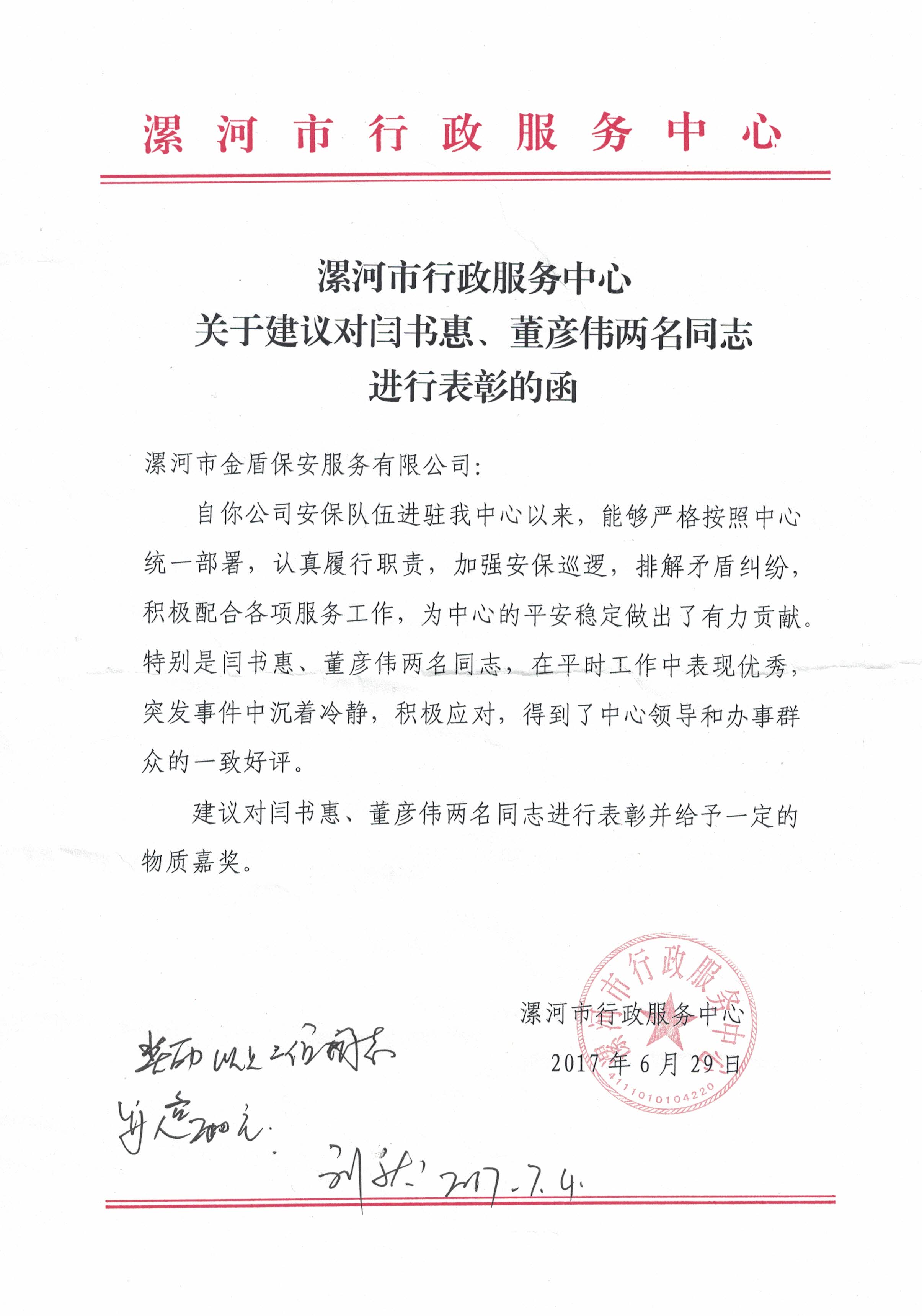 漯河市行政服務中心對金盾保安公司員工的的表彰函